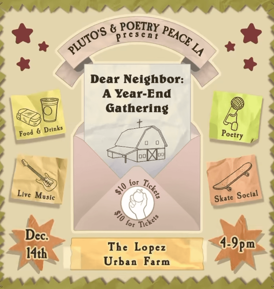 Join Pluto’s and Poetry Peace for their end-of-year event✨ A day to celebrate community coming together and neighbors showing up for each other in the past year #wemadeit🫂 We’ll have a line-up of indie bands, poets, and vendors to spark the holiday mood🍂 An open mic and skate social will also be taking place, so make sure to bring your best words and moves :)) Please dress cozy and bring blankets or whatever will keep you warm (the event is taking place outside)🧤 Entry fee is $10 and we’ll collect in person, Venmo or cash! We can’t wait to see you soon🤎🤎